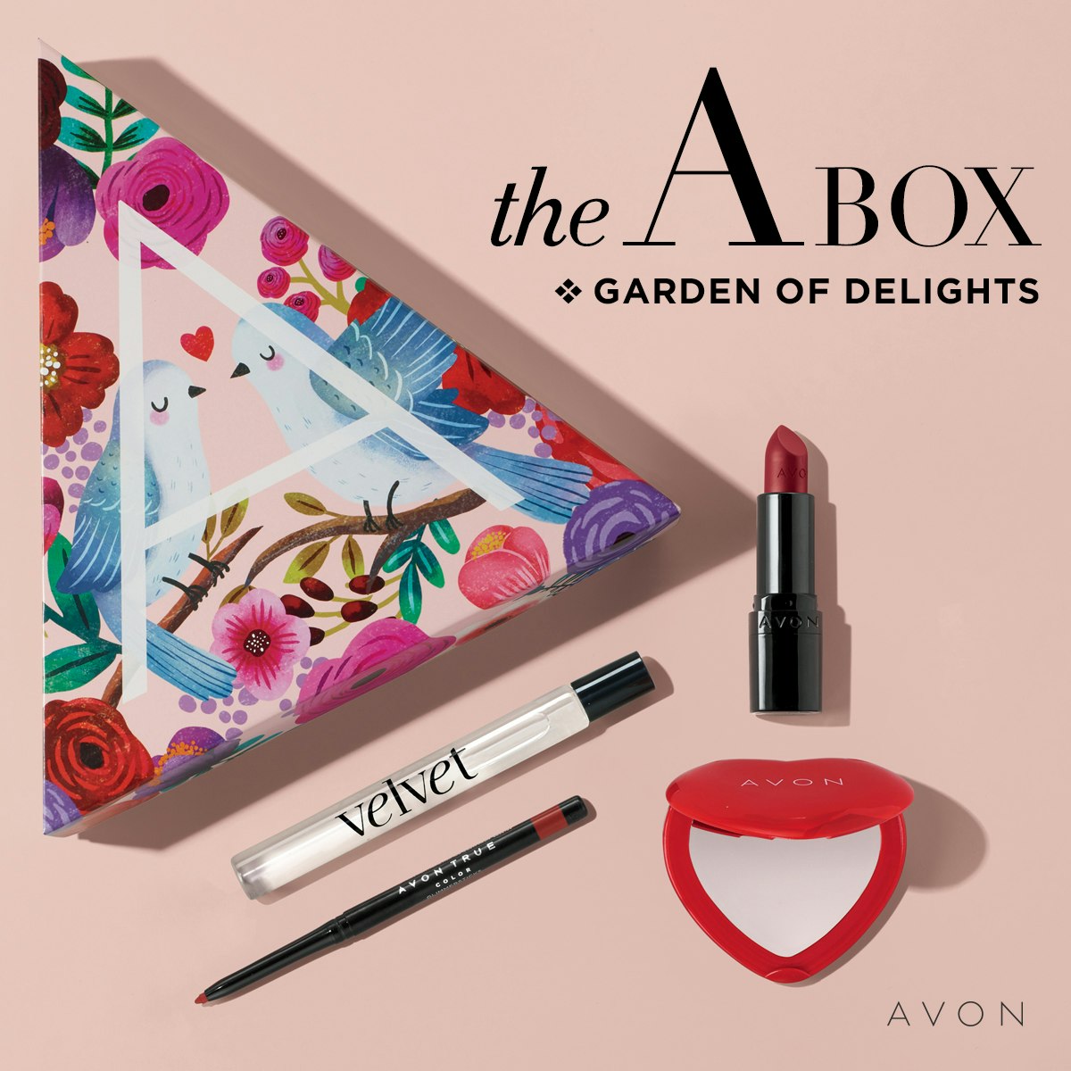 Description: Get ready for romance with a darling bouquet of beauties handpicked just for you! Follow your heart and indulge in the lush, floral scent of Velvet. Then get lavish lips in Cupid’s favorite shade of kissable red. For love at first sight, steal a glance at your new look in a heart-shaped reflection. This $39 value Limited Edition boxed set includes Avon True Color Perfectly Matte Lipstick in Red Supreme, Avon True Color Glimmersticks Lip Liner in True Red, Velvet Eau de Parfum Travel Spray and an A-Box Exclusive heart-shaped travel size mirror.