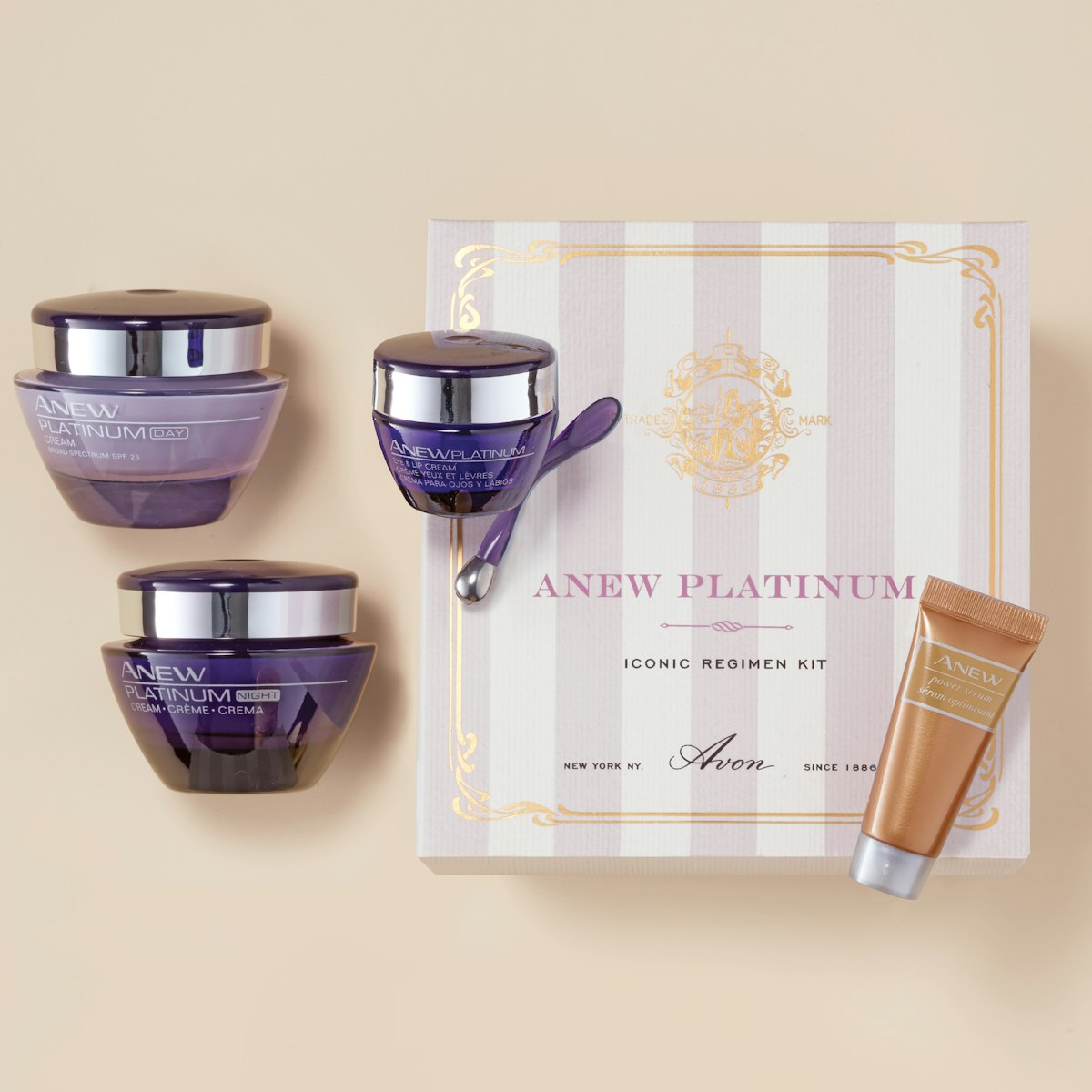 Iconic Anew Platinum Regimen Set (Regular Price: $128 ON SALE: $54.99):Â Now you have a convenient way to experience Platinum regimen products. You can layer the moisturizer over a serum and feel the ultra-lightweight, silky texture on your skin. That first impression is invaluable, with additional benefits seen over time. This 4 piece Limited Edition boxed set includes Anew Platinum Day Cream with SPF 25, Night Cream, Eye & Lip Cream and travel size Anew Power Serum.