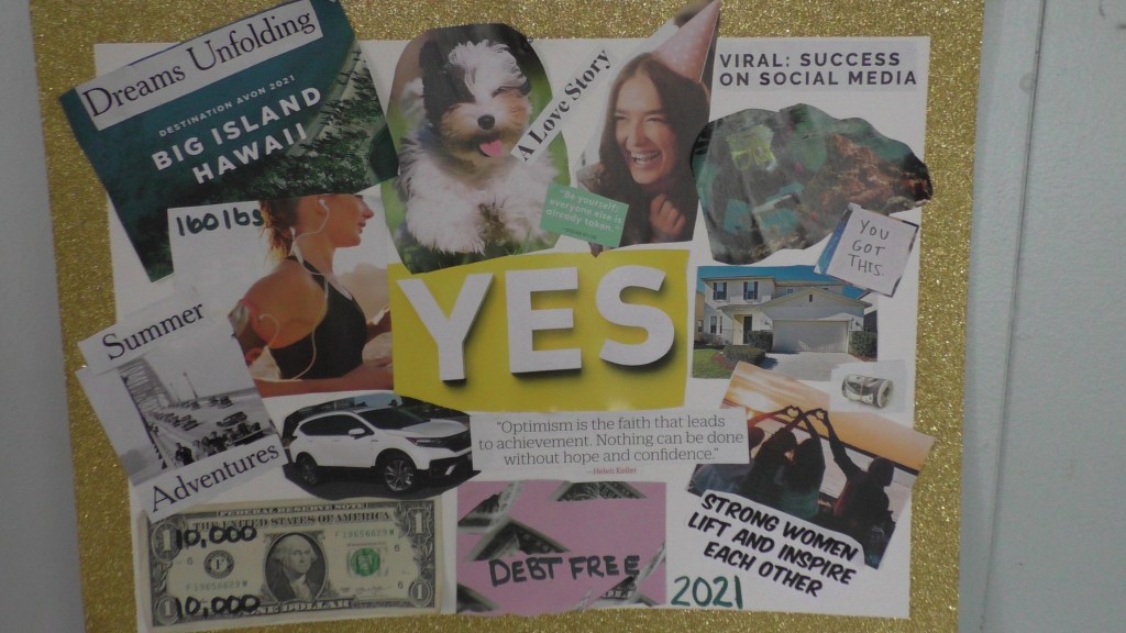 I am not the same person I was when I was turning 31 and joining Avon. Since then I’ve discovered & had to utilize my strength & tenacity to start over. I’ve taken this time to figure out who exactly is Jen Duplisea Antunes that is not connected or reliant on someone else. I’ve had to reflect, acknowledge & most importantly forgive myself. It hasn’t been easy. There have been some days where I struggled. If you read my July blog, you know it’s still occurring. I will say though, the downs are what are helping me heal & be able to move on to the next chapter of my life. What is the next chapter of my life? Well, below is image of my vision board that I’ve recently done.