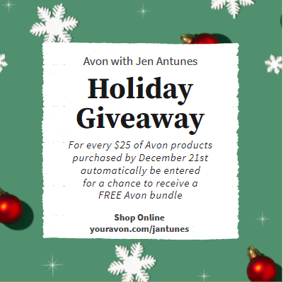 Automatically be entered for a chance to receive a FREE Avon bundle with every $25 purchased with Jen Antunes from November 9, 2021 until December 21, 2021 at youravon.com/jantunes.
