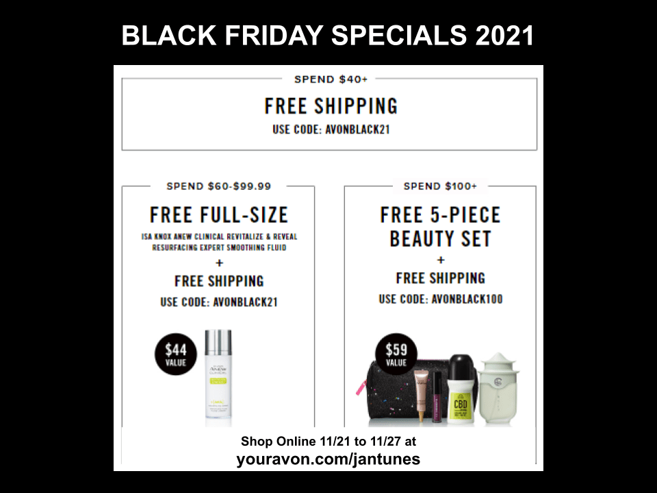 Black Friday deals are back! Enjoy FREE SHIPPING & FREE Avon with your qualifying order from November 21st to November 27th at youravon.com/jantunes.