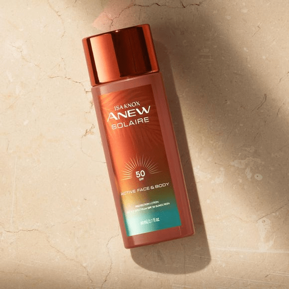 Isa Knox Anew Solaire Active Face & Body Protection Lotion Broad Spectrum SPF 50: Advanced sun protection and luxury skin care in one. Enjoy our highest SPF protection against harmful UVA and UVB rays, with hydrating panthenol, niacinamide and peony extracts to help keep skin feeling hydrated, soft and smooth. It’s a great complement to any morning skin care routine.