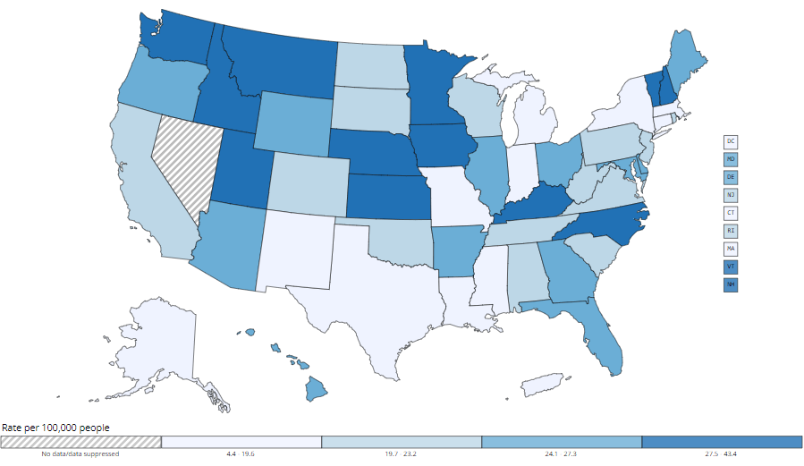 If sun burns, aging skin or sun spots aren’t enough for you to use protection, I would hope skin cancer will be. Though it is the most preventable cancers, according to the National Cancer Institute (NCI, 2023) “new melanoma of the skin cases have been rising on average 1.2% each year between 2010-2019.” In 2023, they estimate 97.610 new melanoma cases with an estimated 7,990 related deaths. If that’s not scary enough, according to American Academy of Dermatology (AAD, 2023), “it is estimated 1 in 5 Americans will develop skin cancer in their lifetime.” As you see in the map below from US Centers for Disease Control & Prevention (CDC), you are seeing an increase in states that are not known for their hot, sunny weather year round.
