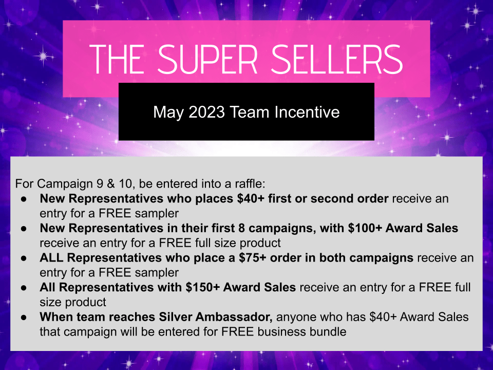 To help support & recognize my team, I offer a monthly team incentive where team members will be automatically entered into various categories to receive business tools, full size products & more based on their sales throughout the month. Plus, with our team achieving Silver Ambassador in C10, I will be raffling off a FREE business bundle!